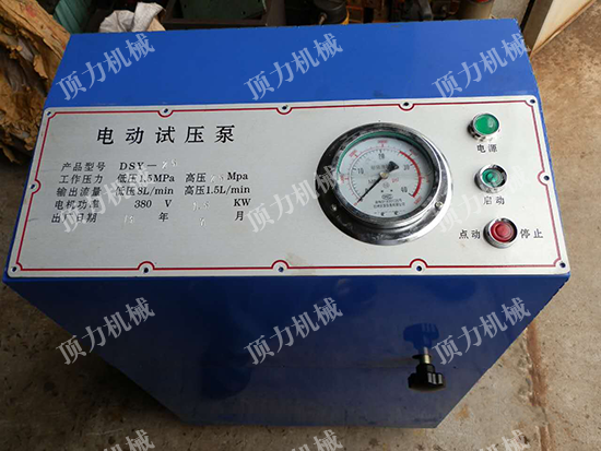 6DSB系列電動試壓泵,由電機直接驅動,高低壓泵同時工作,低壓介質通過單向閥至高壓區,當壓力超過1.5MPa時,低壓溢流閥工作介質回水箱,當高壓壓力上升至調定壓力時,高壓溢流閥工作,以起到了安全保護作用。該機由電機、高低壓泵、控制閥、儲氣筒、壓力表、水箱等組成。
